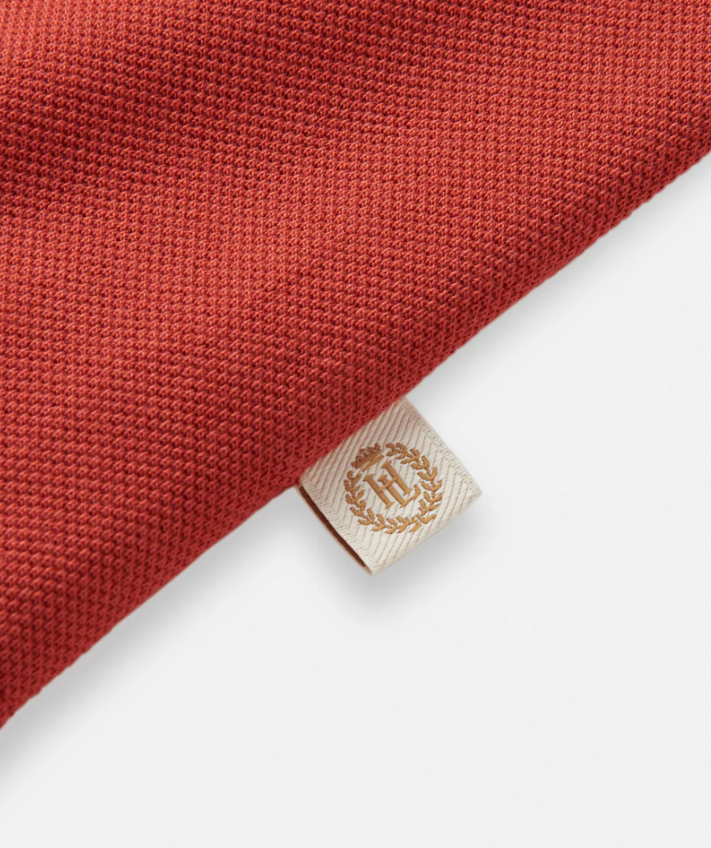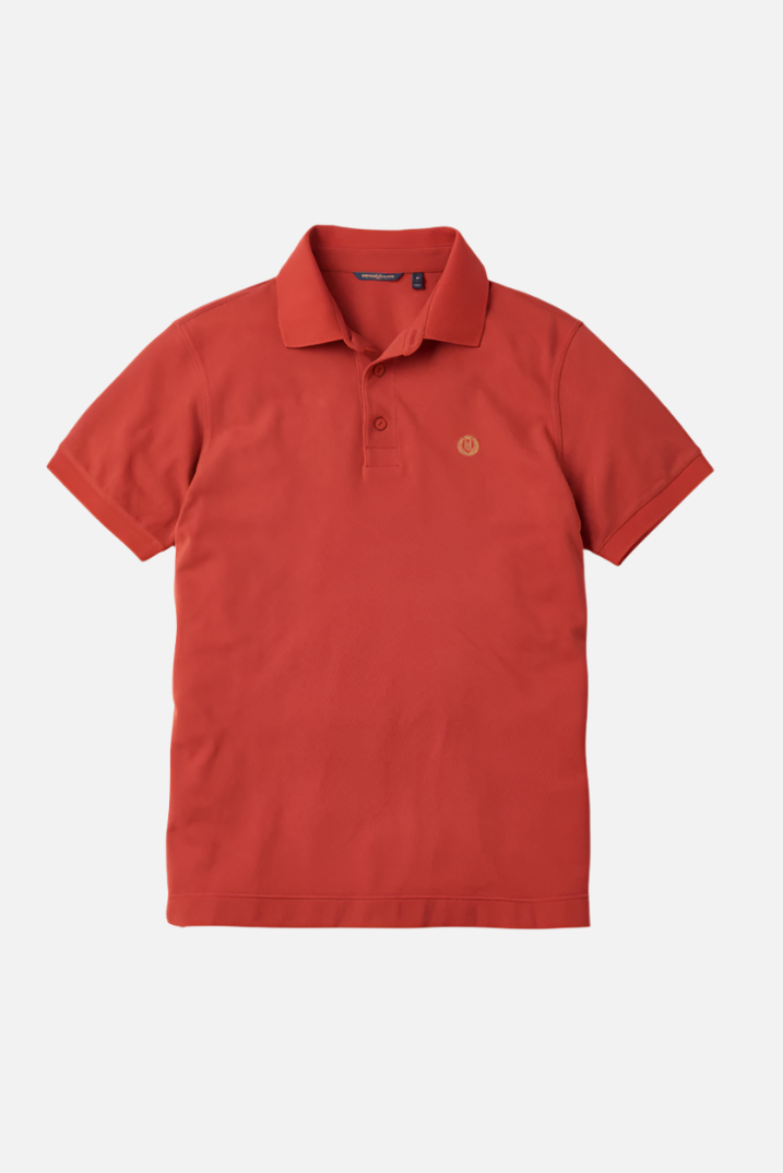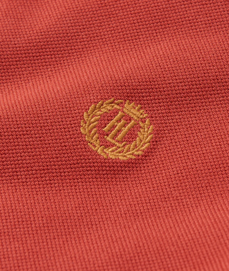 Classic short sleeve polo in a pique fabric with knitted rib collar & cuffs. 100% Organic Cotton with button closure on the centre front and Laurel and crown embroidery at left chest.