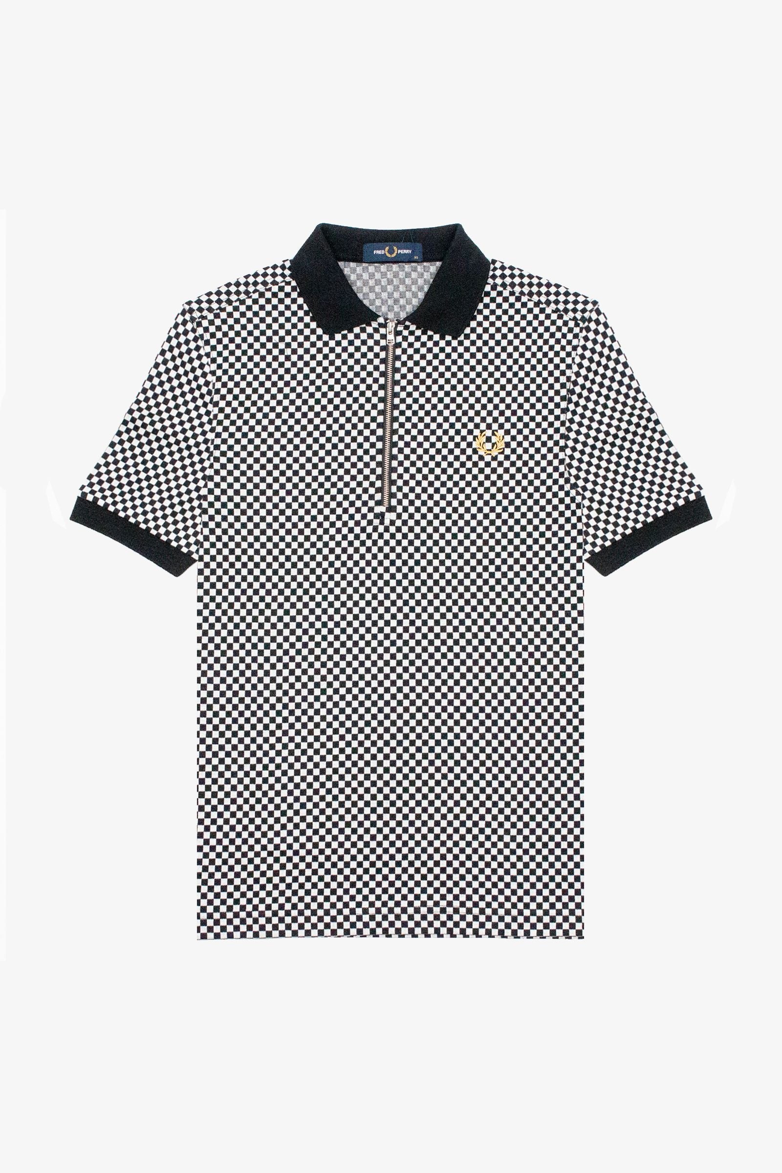 Inspired by the 70's Ska revival, the Fred Perry Chequerboard Zip Neck Polo Shirt arrives this season in the Black colour way. Crafted from a soft and comfortable 100% cotton which has been cut to a regular fit. Designed with a zip placket, high contrast chequerboard design throughout and contrasting collar and cuffs. Finished with ribbed trims and the iconic embroidered Laurel Wreath in a gold tone.