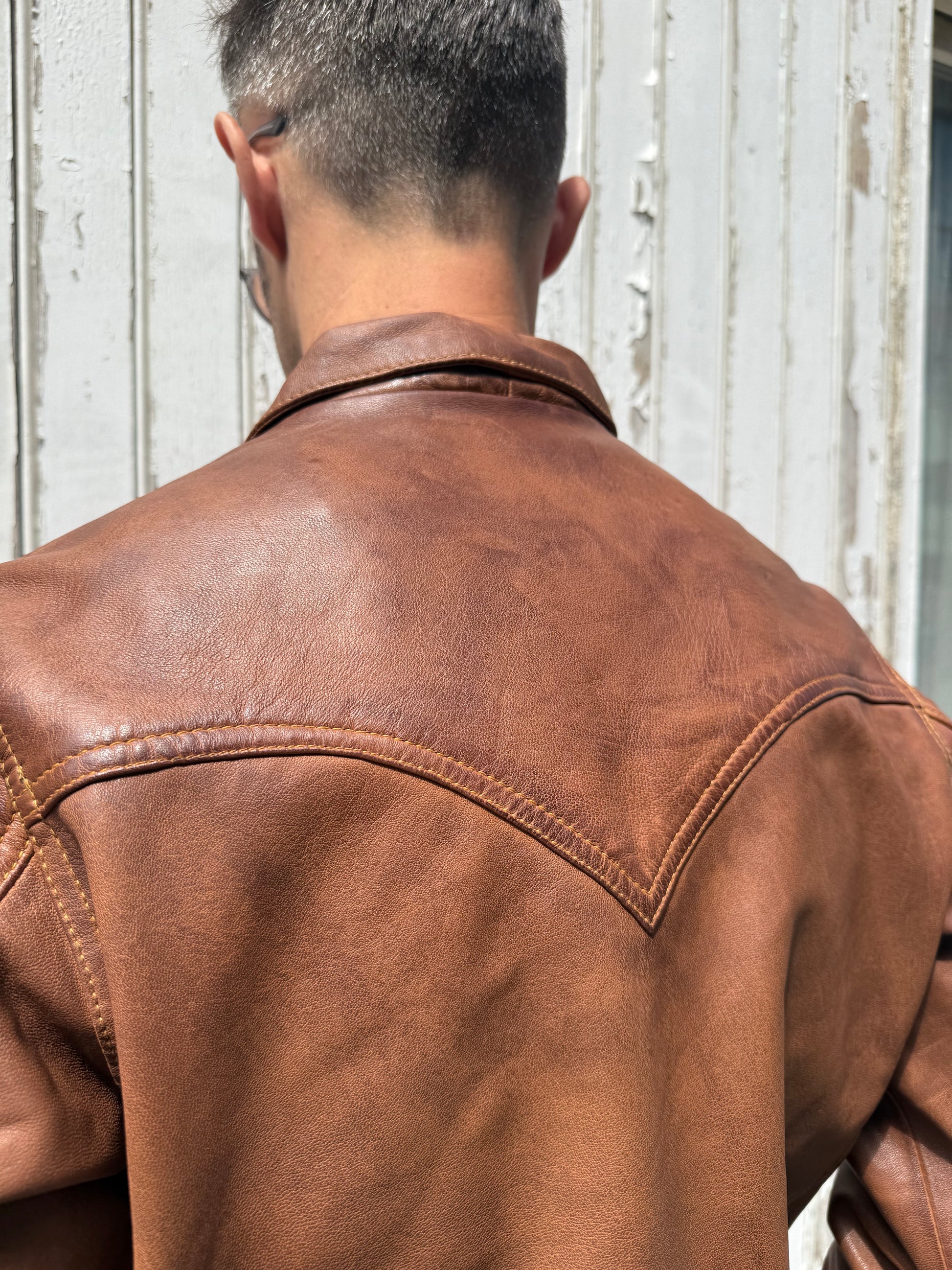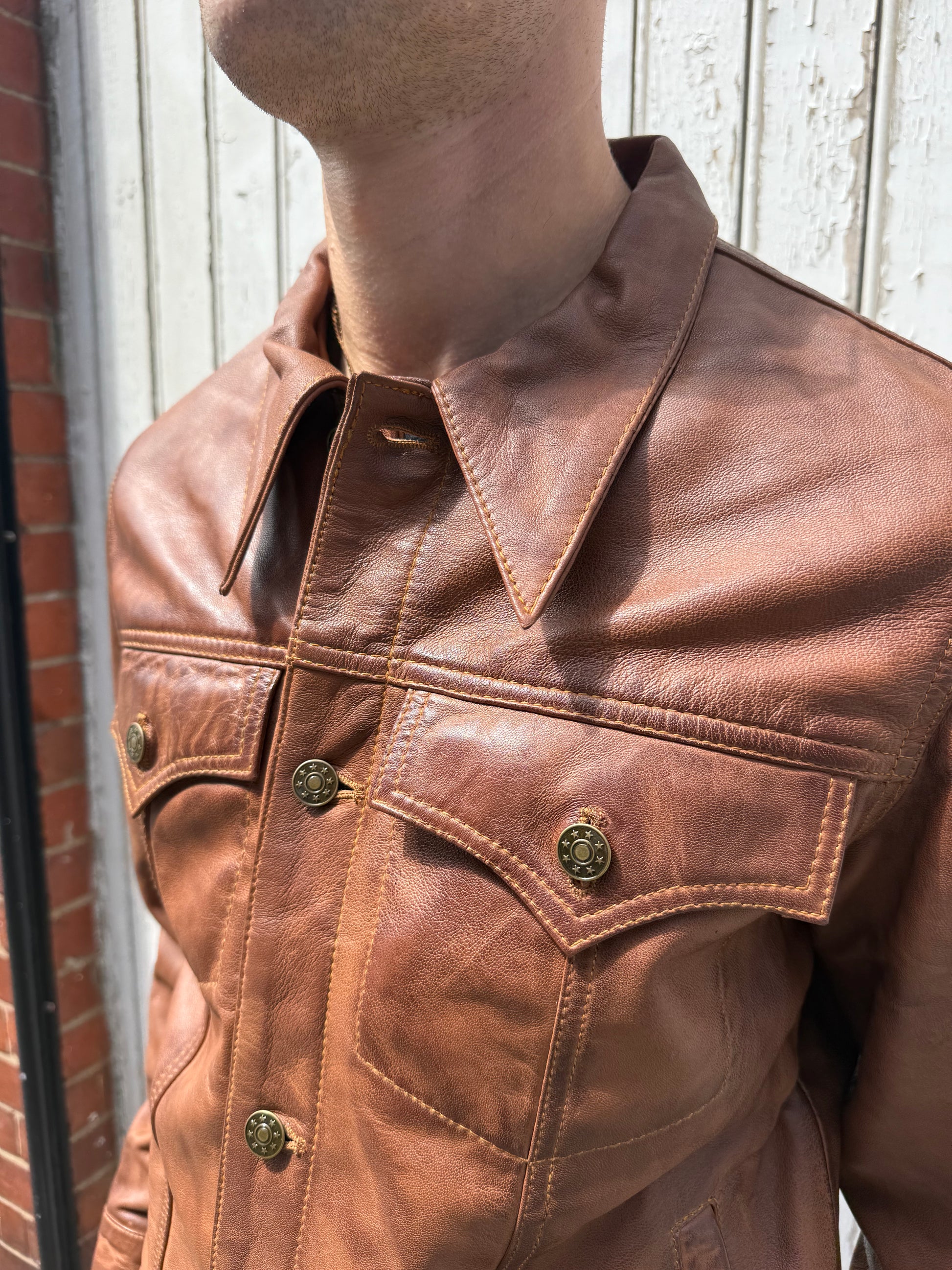 Based on a classic 60’s Trucker Jacket, our super soft luxury men’s spear collared leather has some beautiful details.