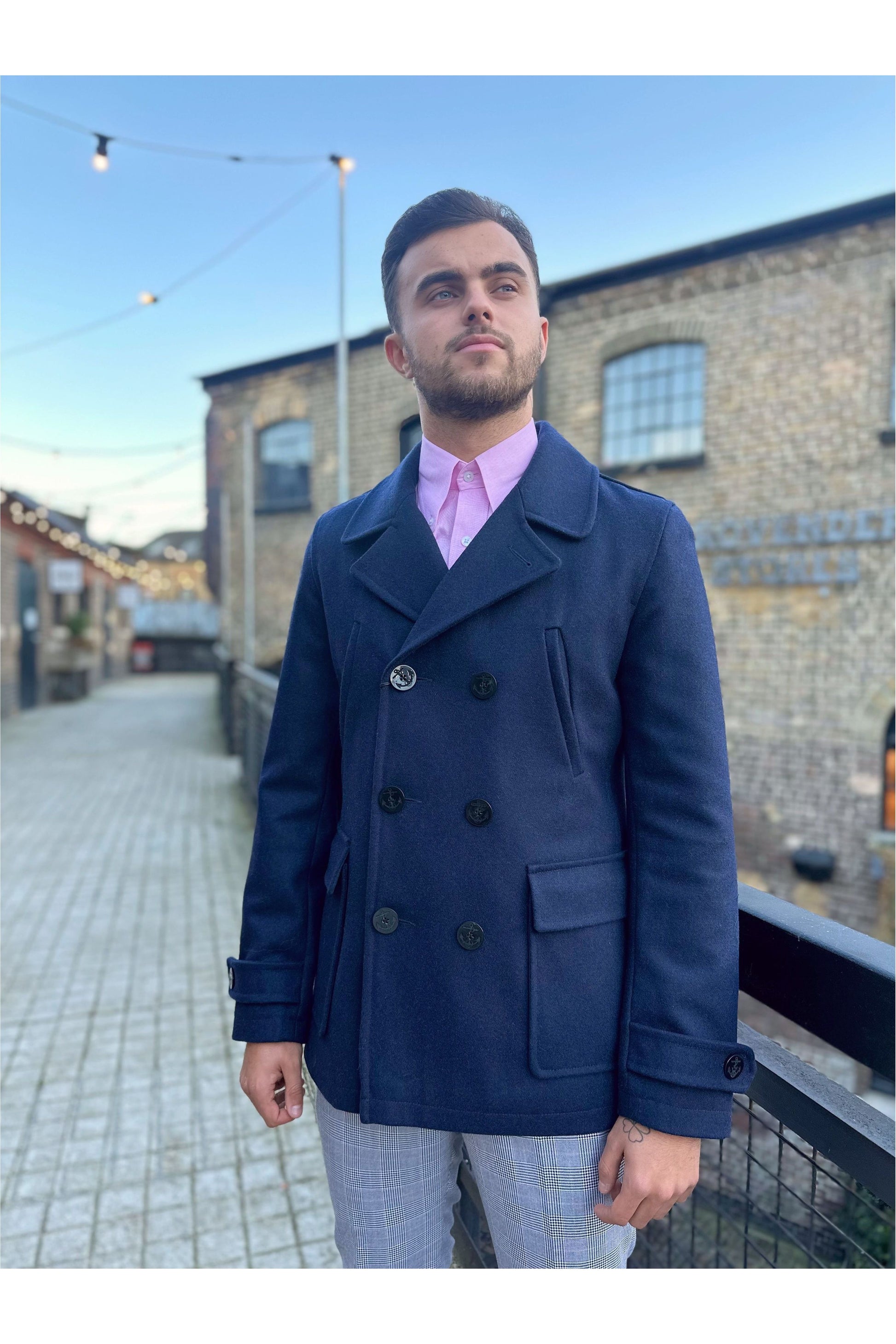 A Classic Navy Pea Coat, proudly made in London.