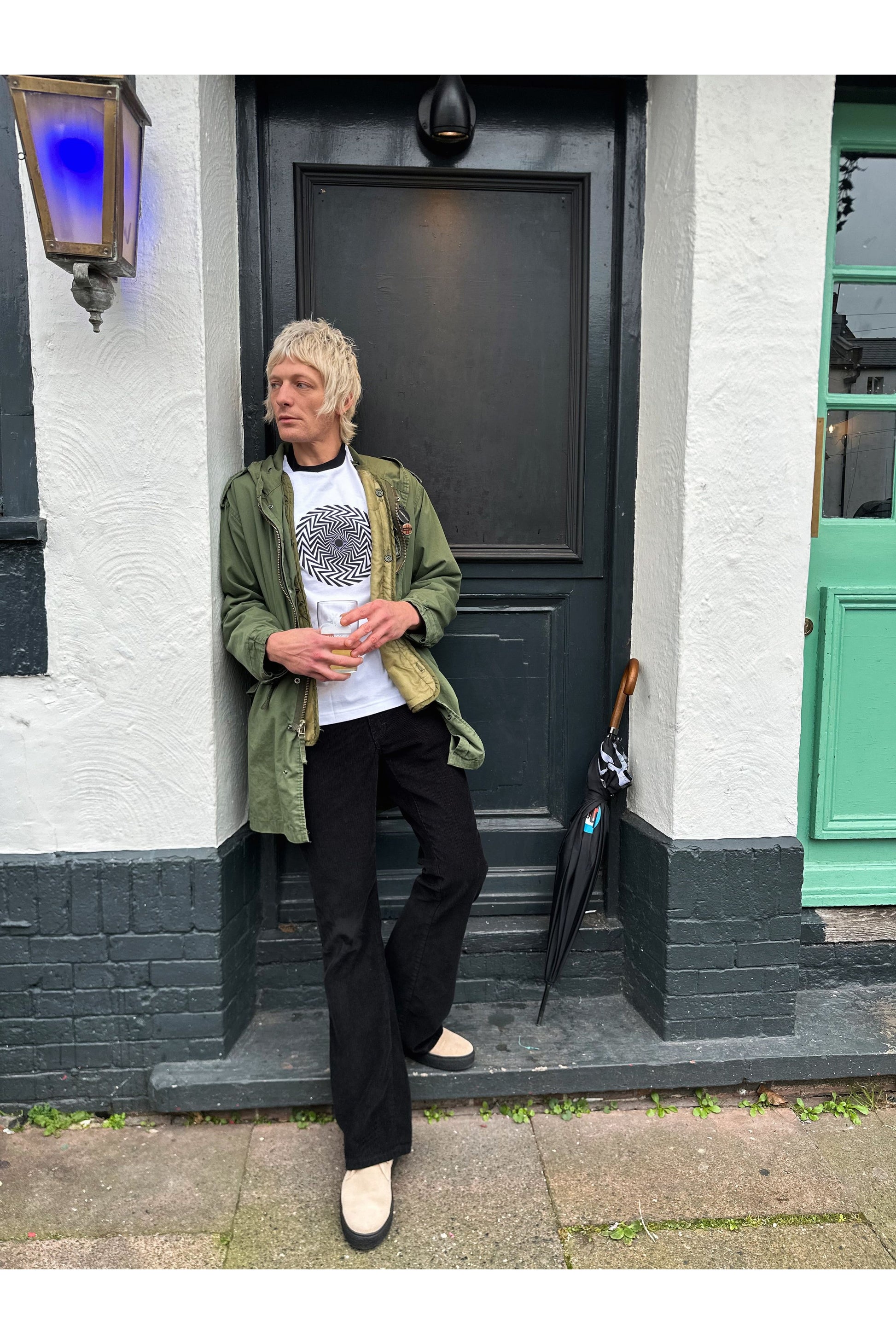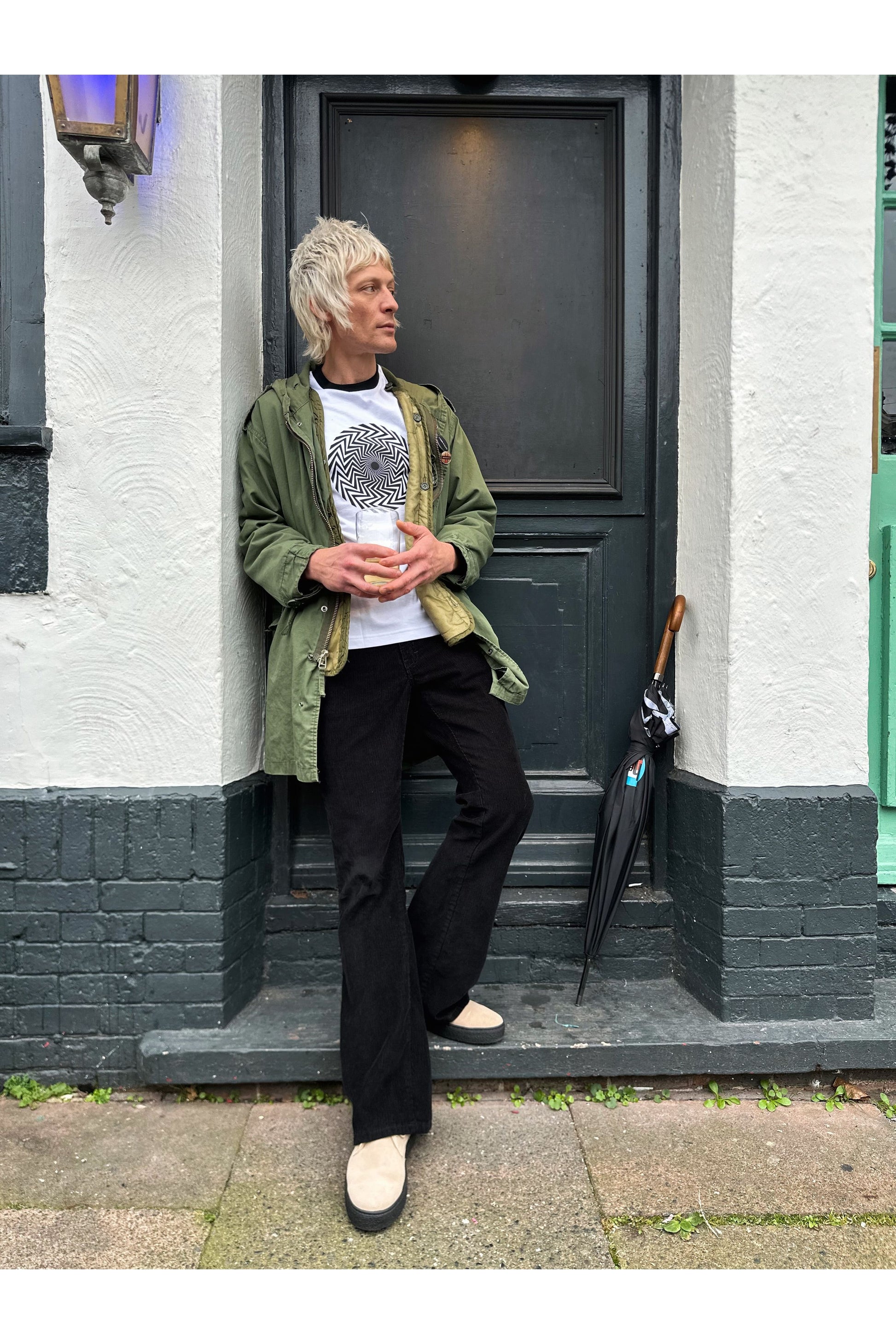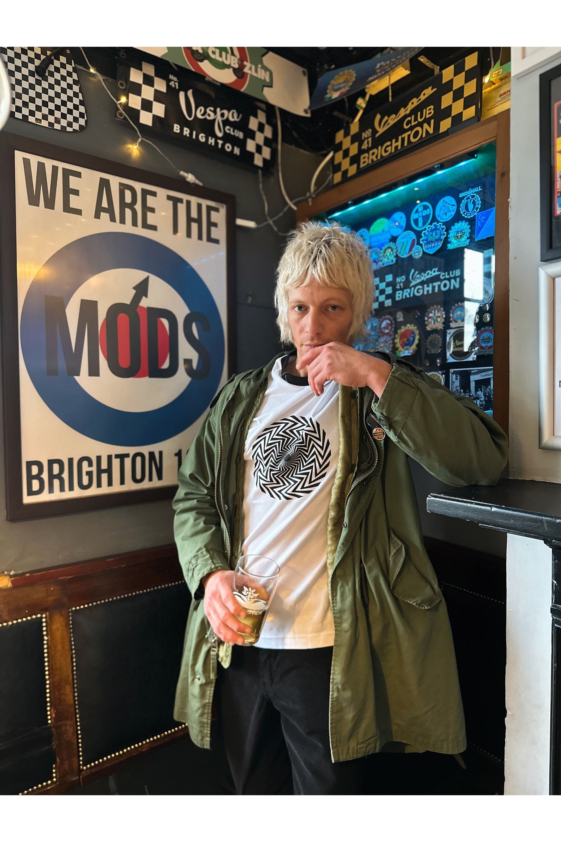 Referencing a beautiful piece of Bridget Riley's optical Illusion artwork from the 1960s, Keith Moon's iconic spiral print T-Shirt was a trippy visual Pop Art expression.