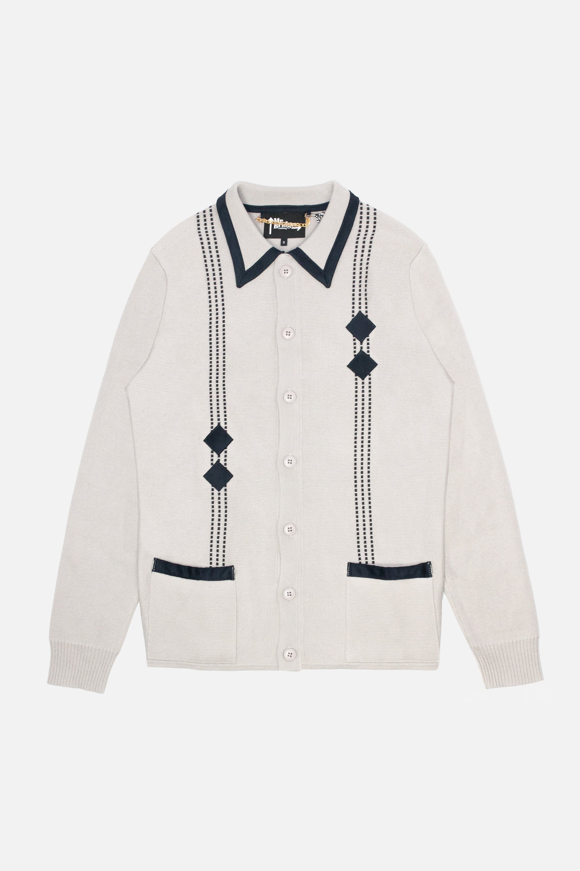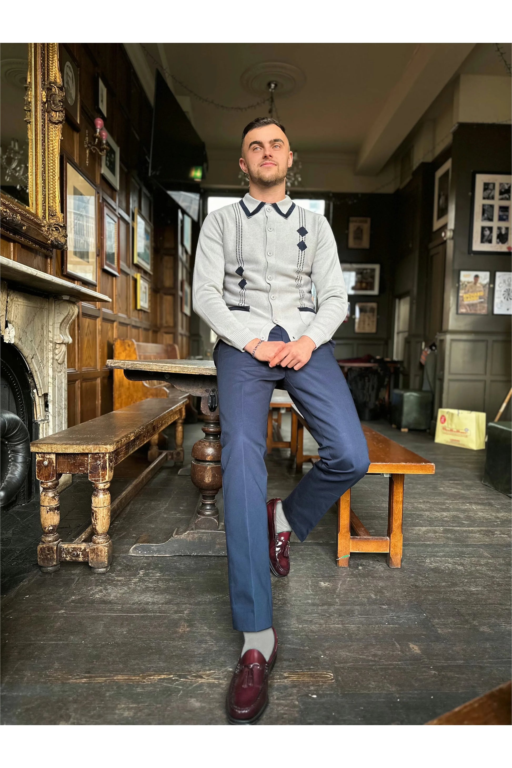 A Dove Grey full button through long sleeve knit, with contrast Navy Blue faux suede (Alcantara) detailing and two functional pockets.