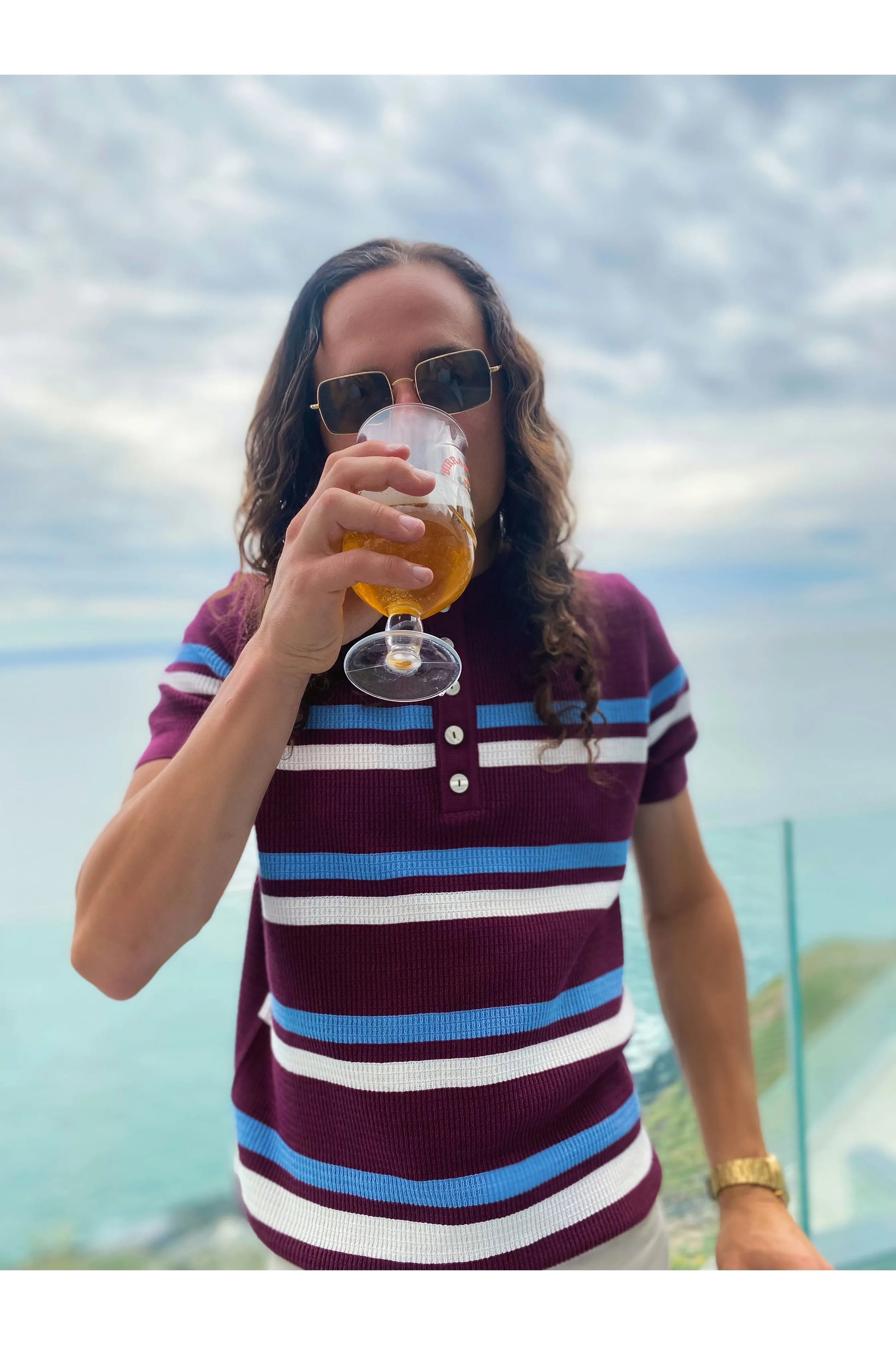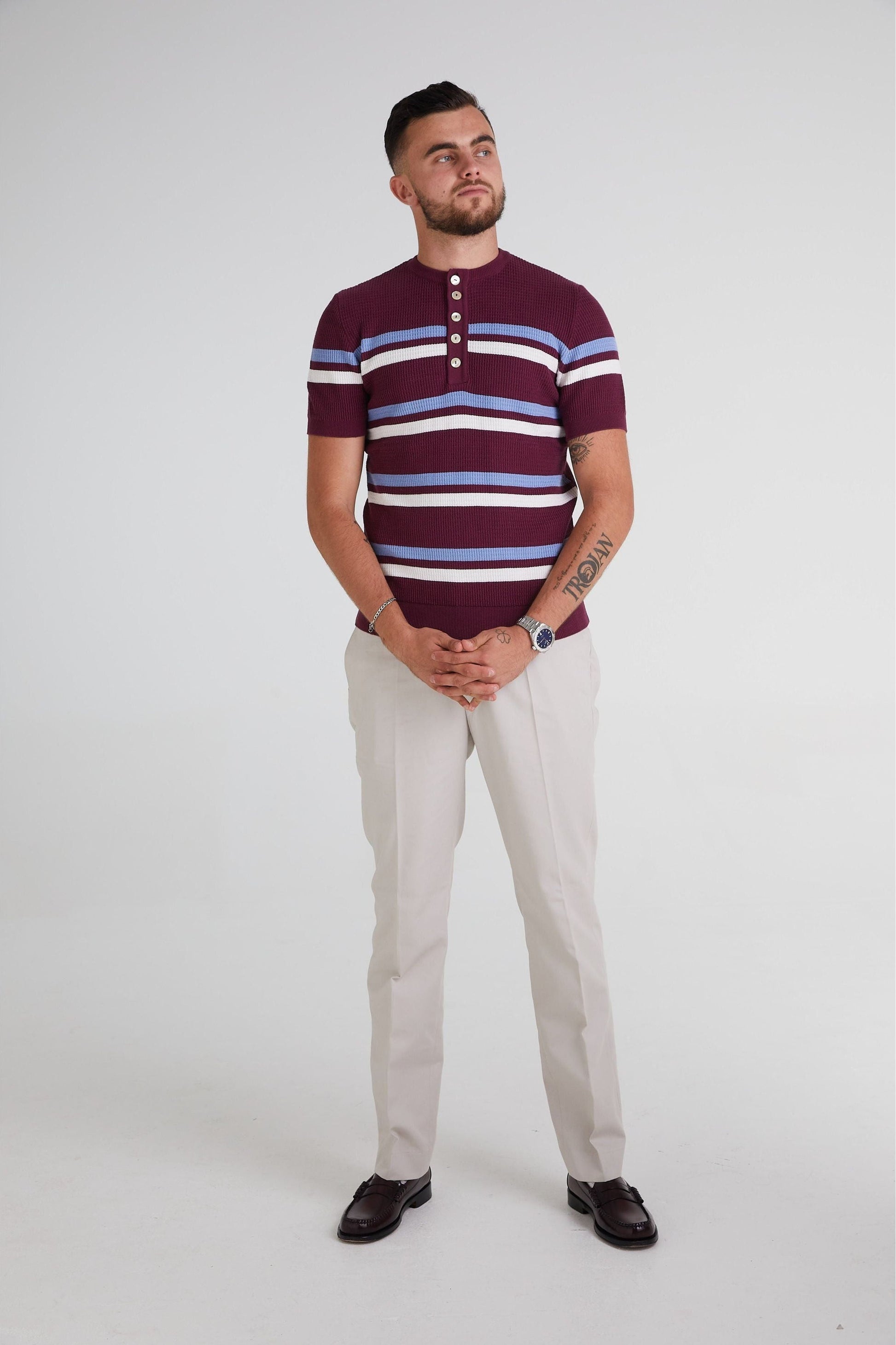 The design also features contrast horizontal stripes, which repeat throughout the garment and are continued on the sleeves.