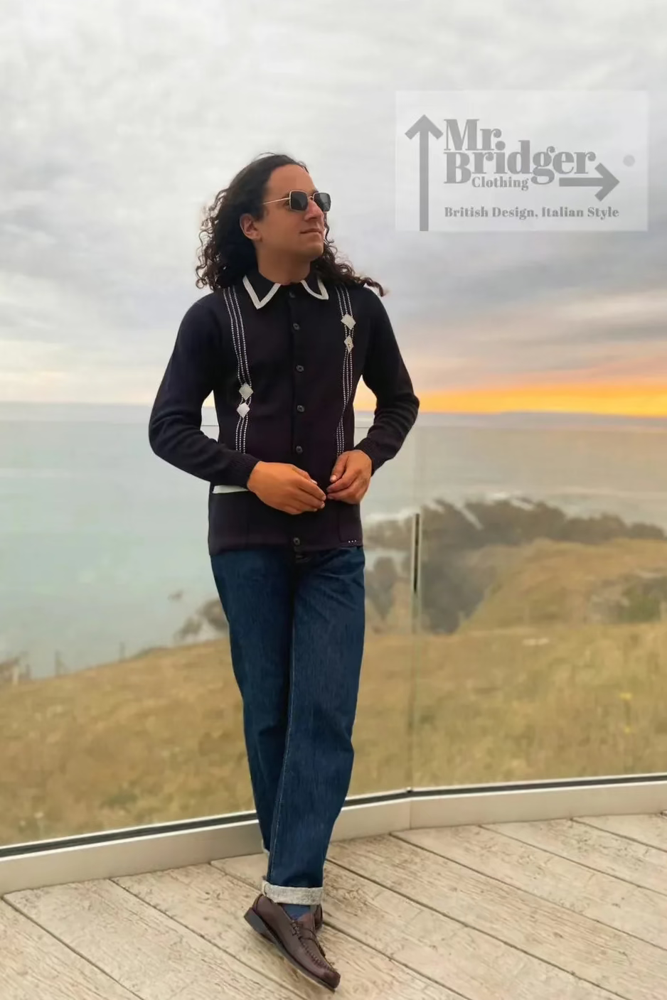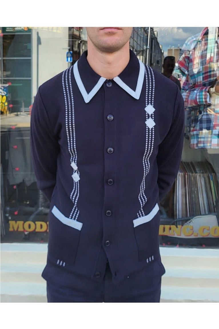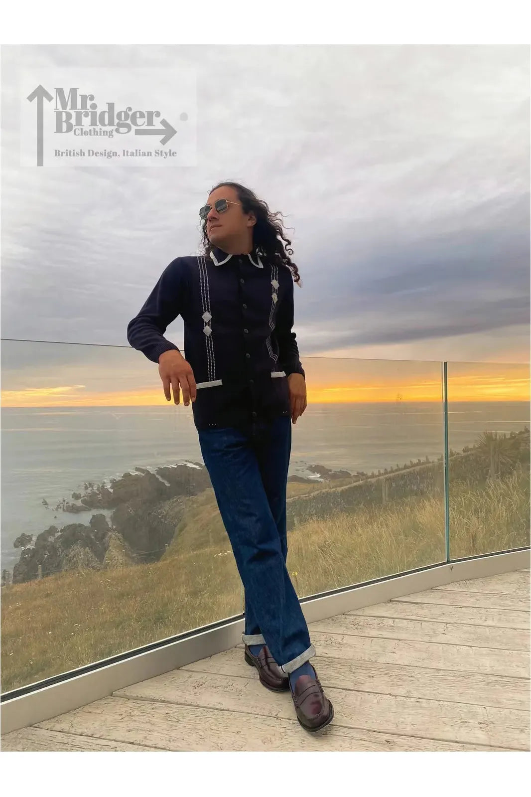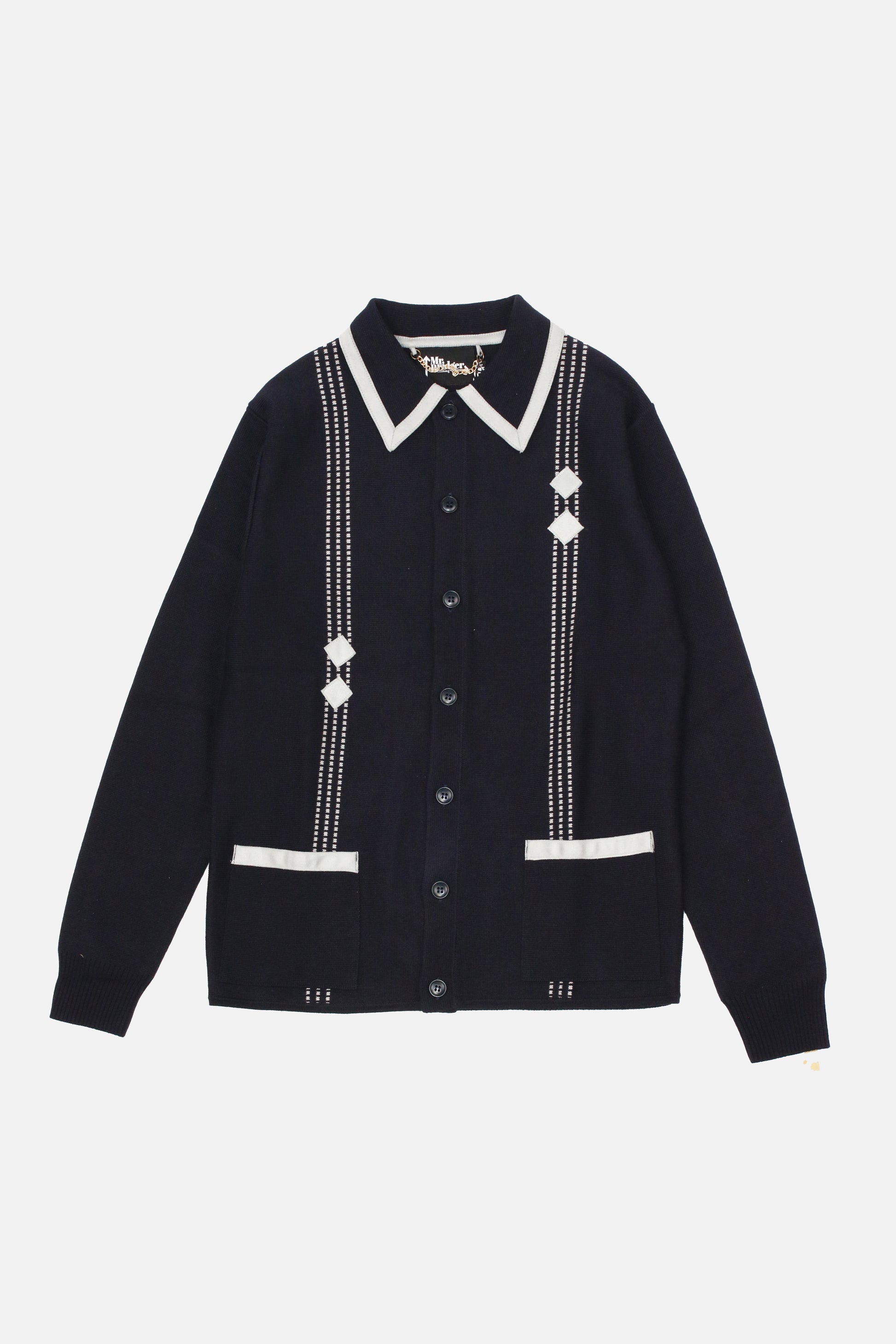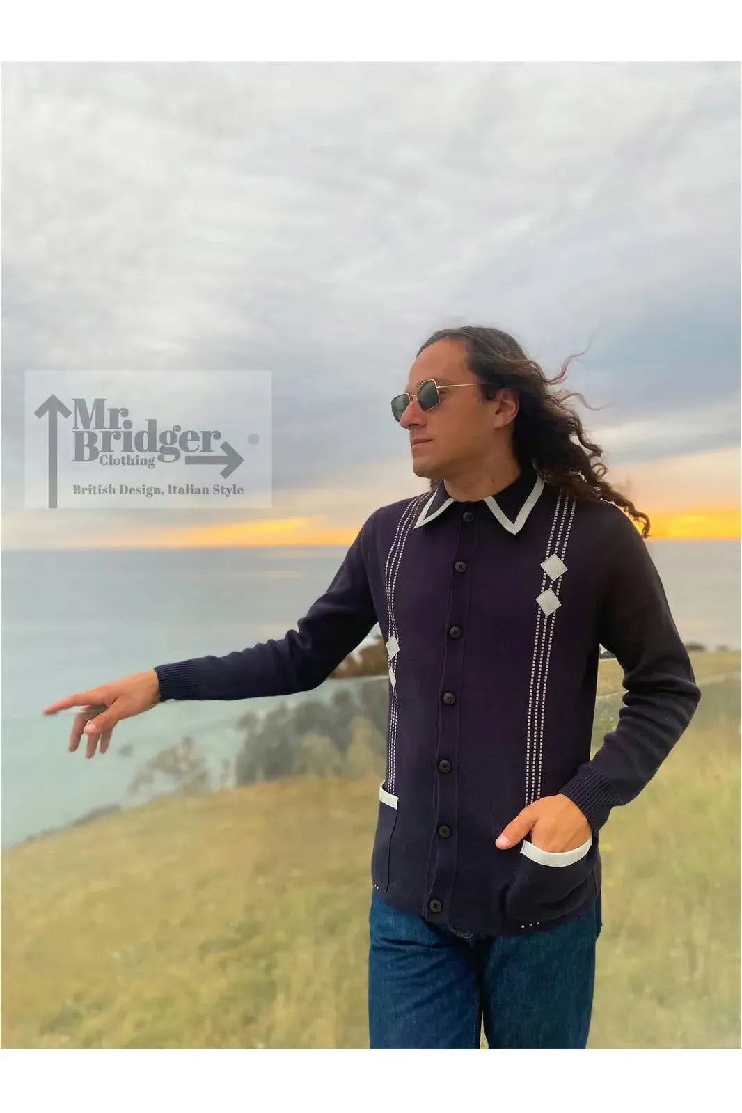 A dark navy full button through long sleeve knit, with contrast dove grey faux suede (Alcantara) detailing and two functional pockets.