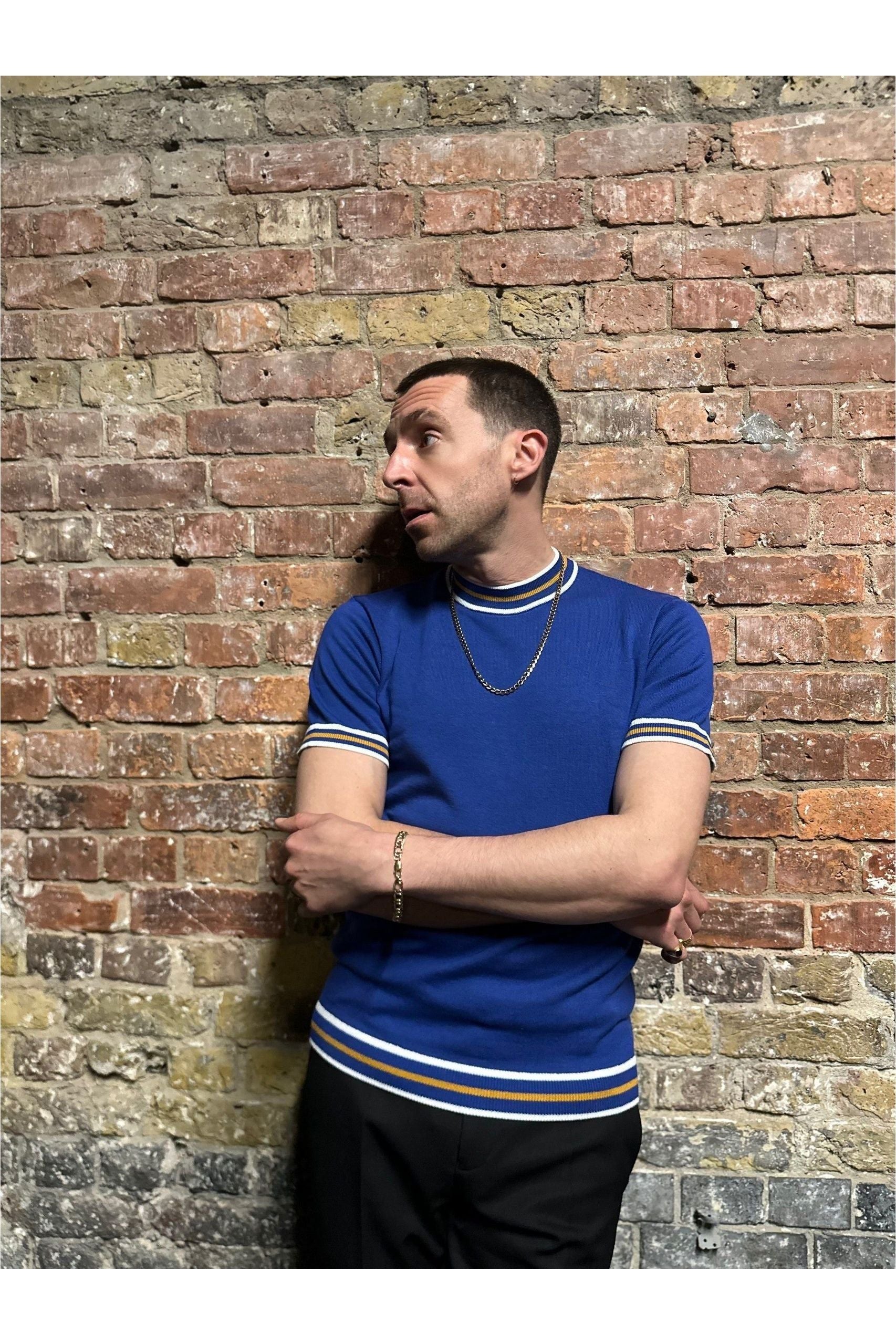 A 1960's inspired short sleeve knit, but with a colour pallet that references the Italian national team home and away jerseys of the mid 90's. An era which saw a bold gold trim added to the collar and cuffs.